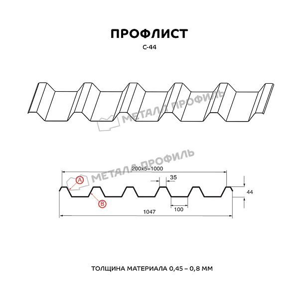 Профнастил С-44 применяется фактически во всех сферах строительства. Он в равной степени пользуется спросом как в гражданском домостроении, так и на индустриальных объектах. Профлист с глубиной волны 44 мм отличается очень высокими несущими показателями. Это самый высокий из профилей с маркировкой С – «стеновой». Он незаменим, если вам необходимо: перекрыть кровлю, поставить забор, оборудовать хозяйственные помещения, возвести стены и перегородки в щитовых зданиях. Помимо этого С-44 обладает достаточной прочностью для строительства каркасов зданий и несъёмной опалубки для железобетона. Профлист С-44 разрешено применять в районах с экстремальными климатическими условиями. Профиль этого материала асимметричен. Лицевая сторона (А) имеет более динамичный рисунок из узких вершин и рекомендована для кровли. Сторона В выглядит более тяжеловесно, рекомендована для всех остальных сфер применения.Покрытие Полиэстер: